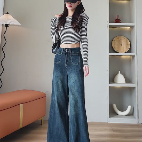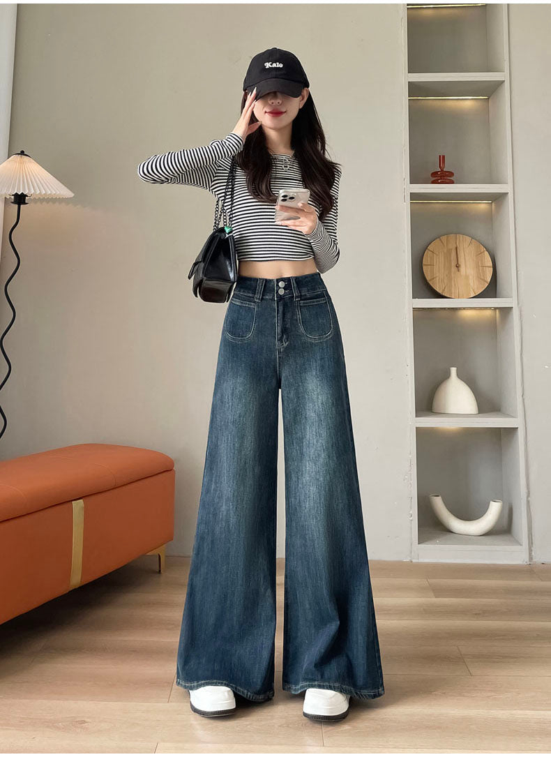 YEEYEEWang - 하이웨이스트 와이드 레그 청바지 – 여성용 릴렉스 핏, 롱 기장